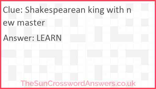 Shakespearean king with new master is a crossword clue for which we have 1 possible answer and we have spotted 1 times in our database. This crossword clue was last seen on 15 February 2021 in The Sun Cryptic Crossword puzzle!