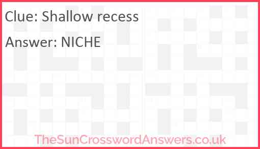 Shallow recess is a crossword clue for which we have 1 possible answer and we have spotted 16 times in our database. This crossword clue was last seen on 21 February 2023 in The Sun Coffee Time Crossword puzzle!