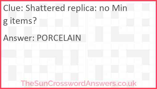 Shattered replica: no Ming items? is a crossword clue for which we have 1 possible answer and we have spotted 2 times in our database. This crossword clue was last seen on 08 December 2023 in The Sun Cryptic Crossword puzzle!