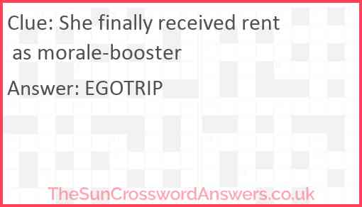 She finally received rent as morale-booster is a crossword clue for which we have 1 possible answer and we have spotted 1 times in our database. This crossword clue was last seen on 22 April 2022 in The Sun Cryptic Crossword puzzle!