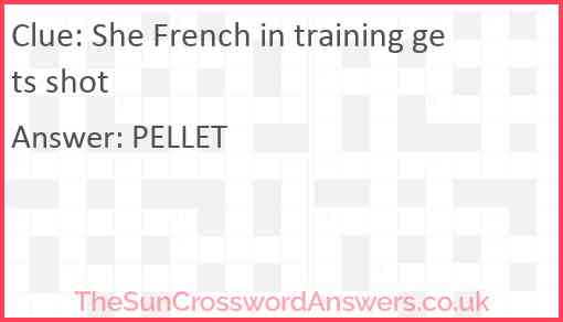 She French in training gets shot is a crossword clue for which we have 1 possible answer and we have spotted 1 times in our database. This crossword clue was last seen on 26 May 2020 in The Sun Cryptic Crossword puzzle!