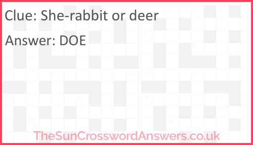 She-rabbit or deer is a crossword clue for which we have 1 possible answer and we have spotted 11 times in our database. This crossword clue was last seen on 23 March 2024 in The Sun Coffee Time Crossword puzzle!