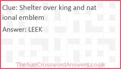 Shelter over king and national emblem is a crossword clue for which we have 1 possible answer and we have spotted 2 times in our database. This crossword clue was last seen on 03 July 2024 in The Sun Cryptic Crossword puzzle!