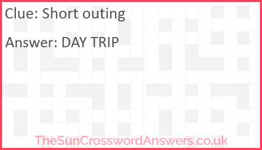 Short outing is a crossword clue for which we have 2 possible answer and we have spotted 2 times in our database. This crossword clue was last seen on 03 October 2022 in The Sun Coffee Time Crossword puzzle!