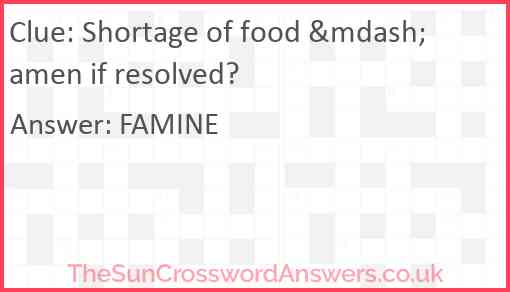 Shortage of food — amen if resolved? is a crossword clue for which we have 1 possible answer and we have spotted 1 times in our database. This crossword clue was last seen on 09 November 2019 in The Sun Cryptic Crossword puzzle!