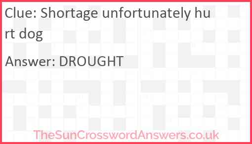 Shortage unfortunately hurt dog is a crossword clue for which we have 1 possible answer and we have spotted 2 times in our database. This crossword clue was last seen on 13 September 2023 in The Sun Cryptic Crossword puzzle!