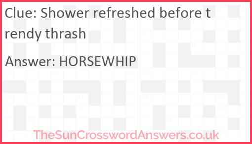 Shower refreshed before trendy thrash is a crossword clue for which we have 1 possible answer and we have spotted 1 times in our database. This crossword clue was last seen on 09 June 2022 in The Sun Cryptic Crossword puzzle!