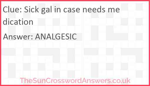 Sick gal in case needs medication is a crossword clue for which we have 1 possible answer and we have spotted 2 times in our database. This crossword clue was last seen on 14 December 2023 in The Sun Cryptic Crossword puzzle!