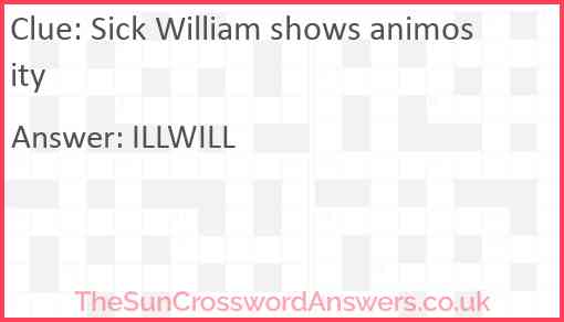 Sick William shows animosity is a crossword clue for which we have 1 possible answer and we have spotted 2 times in our database. This crossword clue was last seen on 06 March 2024 in The Sun Cryptic Crossword puzzle!