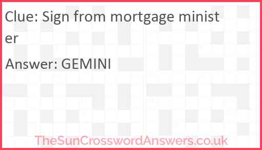 Sign from mortgage minister is a crossword clue for which we have 1 possible answer and we have spotted 5 times in our database. This crossword clue was last seen on 30 May 2025 in The Sun Cryptic Crossword puzzle!