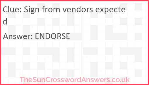 Sign from vendors expected is a crossword clue for which we have 1 possible answer and we have spotted 1 times in our database. This crossword clue was last seen on 22 July 2021 in The Sun Cryptic Crossword puzzle!