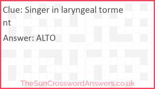 Singer in laryngeal torment is a crossword clue for which we have 1 possible answer and we have spotted 2 times in our database. This crossword clue was last seen on 29 January 2025 in The Sun Cryptic Crossword puzzle!