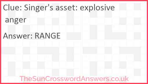 Singer's asset: explosive anger is a crossword clue for which we have 1 possible answer and we have spotted 1 times in our database. This crossword clue was last seen on 02 May 2024 in The Sun Cryptic Crossword puzzle!