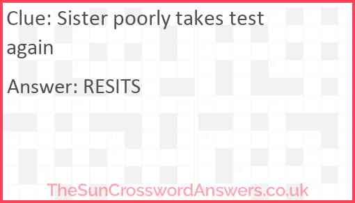 Sister poorly takes test again is a crossword clue for which we have 1 possible answer and we have spotted 1 times in our database. This crossword clue was last seen on 31 May 2020 in The Sun Cryptic Crossword puzzle!