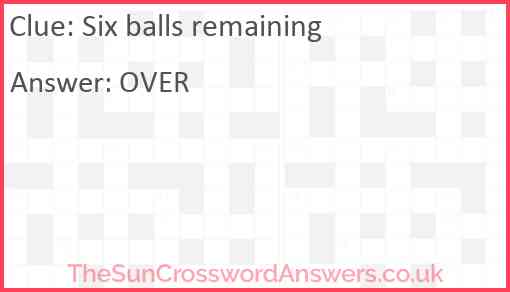 Six balls remaining is a crossword clue for which we have 1 possible answer and we have spotted 2 times in our database. This crossword clue was last seen on 03 May 2021 in The Sun Cryptic Crossword puzzle!