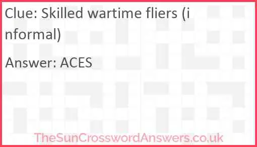 Skilled wartime fliers (informal) is a crossword clue for which we have 1 possible answer and we have spotted 1 times in our database. This crossword clue was last seen on 01 February 2020 in The Sun Coffee Time Crossword puzzle!