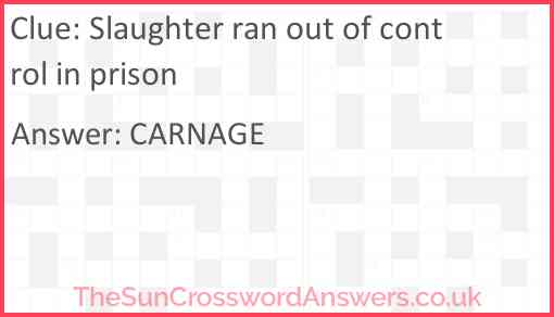 Slaughter ran out of control in prison is a crossword clue for which we have 1 possible answer and we have spotted 3 times in our database. This crossword clue was last seen on 18 March 2025 in The Sun Cryptic Crossword puzzle!