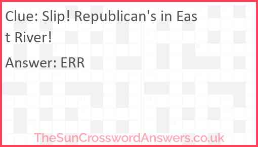 Slip! Republican's in East River! is a crossword clue for which we have 1 possible answer and we have spotted 2 times in our database. This crossword clue was last seen on 18 March 2023 in The Sun Cryptic Crossword puzzle!