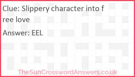 Slippery character into free love is a crossword clue for which we have 1 possible answer and we have spotted 2 times in our database. This crossword clue was last seen on 22 May 2024 in The Sun Cryptic Crossword puzzle!