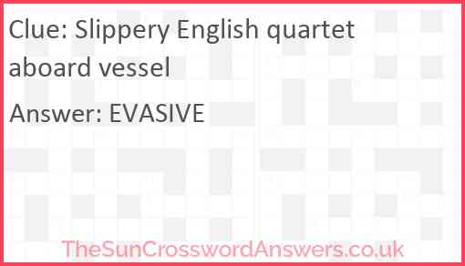 Slippery English quartet aboard vessel is a crossword clue for which we have 1 possible answer and we have spotted 4 times in our database. This crossword clue was last seen on 18 October 2024 in The Sun Cryptic Crossword puzzle!