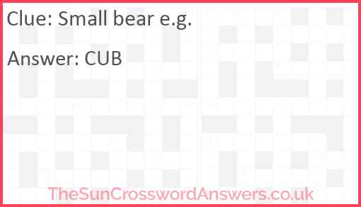 Small bear e.g. is a crossword clue for which we have 1 possible answer and we have spotted 3 times in our database. This crossword clue was last seen on 25 April 2025 in The Sun Coffee Time Crossword puzzle!