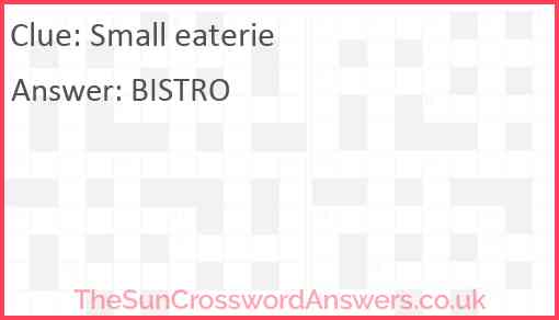 Small eaterie is a crossword clue for which we have 1 possible answer and we have spotted 3 times in our database. This crossword clue was last seen on 24 January 2023 in The Sun Coffee Time Crossword puzzle!