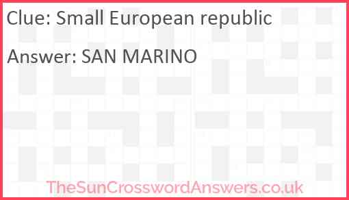 Small European republic is a crossword clue for which we have 1 possible answer and we have spotted 1 times in our database. This crossword clue was last seen on 01 June 2019 in The Sun Coffee Time Crossword puzzle!