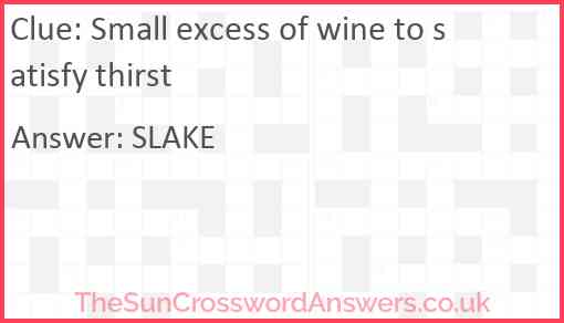Small excess of wine to satisfy thirst is a crossword clue for which we have 1 possible answer and we have spotted 1 times in our database. This crossword clue was last seen on 04 November 2021 in The Sun Cryptic Crossword puzzle!