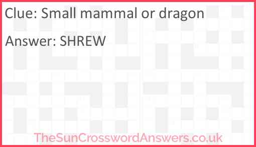 Small mammal or dragon is a crossword clue for which we have 1 possible answer and we have spotted 3 times in our database. This crossword clue was last seen on 07 April 2024 in The Sun Cryptic Crossword puzzle!