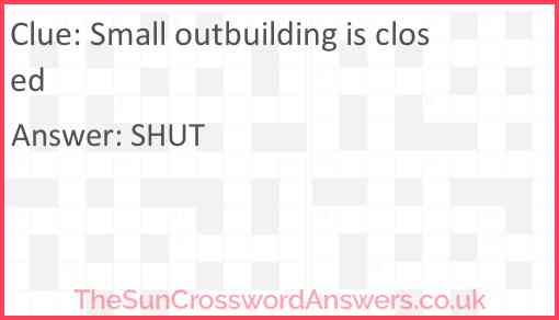 Small outbuilding is closed is a crossword clue for which we have 1 possible answer and we have spotted 1 times in our database. This crossword clue was last seen on 19 October 2018 in The Sun Cryptic Crossword puzzle!