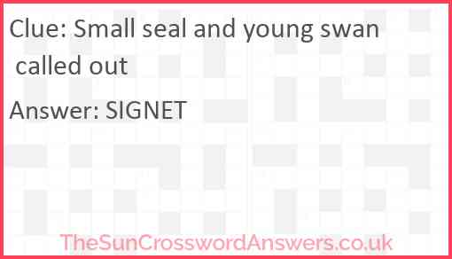 Small seal and young swan called out is a crossword clue for which we have 1 possible answer and we have spotted 2 times in our database. This crossword clue was last seen on 11 July 2024 in The Sun Cryptic Crossword puzzle!