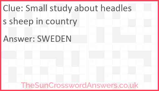 Small study about headless sheep in country is a crossword clue for which we have 1 possible answer and we have spotted 2 times in our database. This crossword clue was last seen on 10 February 2022 in The Sun Cryptic Crossword puzzle!