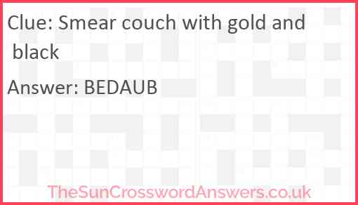 Smear couch with gold and black is a crossword clue for which we have 1 possible answer and we have spotted 2 times in our database. This crossword clue was last seen on 12 November 2023 in The Sun Cryptic Crossword puzzle!