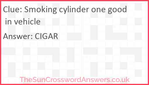 Smoking cylinder one good in vehicle is a crossword clue for which we have 1 possible answer and we have spotted 2 times in our database. This crossword clue was last seen on 18 June 2023 in The Sun Cryptic Crossword puzzle!