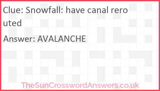 Snowfall: have canal rerouted is a crossword clue for which we have 1 possible answer and we have spotted 3 times in our database. This crossword clue was last seen on 30 November 2024 in The Sun Cryptic Crossword puzzle!