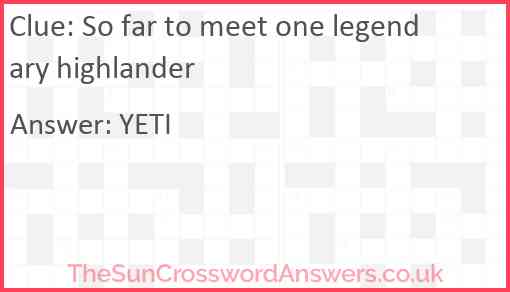 So far to meet one legendary highlander is a crossword clue for which we have 1 possible answer and we have spotted 1 times in our database. This crossword clue was last seen on 18 June 2019 in The Sun Cryptic Crossword puzzle!