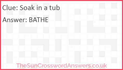 Soak in a tub is a crossword clue for which we have 1 possible answer and we have spotted 2 times in our database. This crossword clue was last seen on 04 April 2019 in The Sun Coffee Time Crossword puzzle!