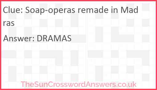 Soap-operas remade in Madras is a crossword clue for which we have 1 possible answer and we have spotted 2 times in our database. This crossword clue was last seen on 28 October 2023 in The Sun Cryptic Crossword puzzle!