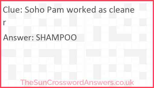 Soho Pam worked as cleaner is a crossword clue for which we have 1 possible answer and we have spotted 3 times in our database. This crossword clue was last seen on 25 May 2025 in The Sun Cryptic Crossword puzzle!