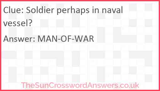 Soldier perhaps in naval vessel? is a crossword clue for which we have 2 possible answer and we have spotted 2 times in our database. This crossword clue was last seen on 30 August 2023 in The Sun Cryptic Crossword puzzle!