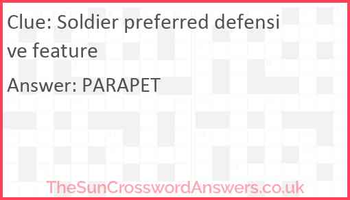 Soldier preferred defensive feature is a crossword clue for which we have 1 possible answer and we have spotted 3 times in our database. This crossword clue was last seen on 27 November 2023 in The Sun Cryptic Crossword puzzle!