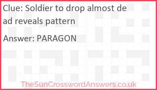 Soldier to drop almost dead reveals pattern is a crossword clue for which we have 1 possible answer and we have spotted 1 times in our database. This crossword clue was last seen on 04 March 2021 in The Sun Cryptic Crossword puzzle!