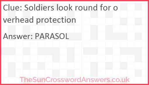 Soldiers look round for overhead protection is a crossword clue for which we have 1 possible answer and we have spotted 2 times in our database. This crossword clue was last seen on 29 April 2024 in The Sun Cryptic Crossword puzzle!