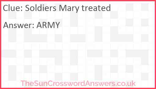 Soldiers Mary treated is a crossword clue for which we have 1 possible answer and we have spotted 2 times in our database. This crossword clue was last seen on 23 November 2022 in The Sun Cryptic Crossword puzzle!