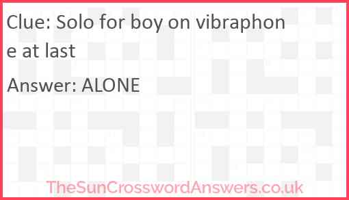 Solo for boy on vibraphone at last is a crossword clue for which we have 1 possible answer and we have spotted 3 times in our database. This crossword clue was last seen on 24 July 2025 in The Sun Cryptic Crossword puzzle!