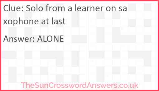 Solo from a learner on saxophone at last is a crossword clue for which we have 1 possible answer and we have spotted 2 times in our database. This crossword clue was last seen on 15 October 2024 in The Sun Cryptic Crossword puzzle!