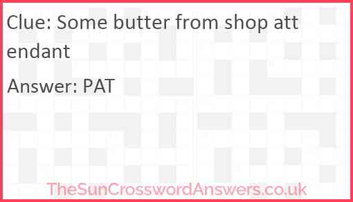 Some butter from shop attendant is a crossword clue for which we have 1 possible answer and we have spotted 1 times in our database. This crossword clue was last seen on 22 December 2018 in The Sun Cryptic Crossword puzzle!