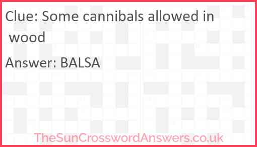 Some cannibals allowed in wood is a crossword clue for which we have 1 possible answer and we have spotted 1 times in our database. This crossword clue was last seen on 15 July 2024 in The Sun Cryptic Crossword puzzle!