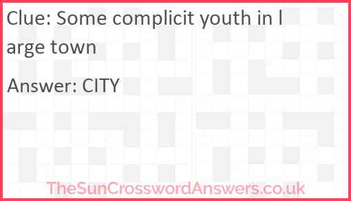 Some complicit youth in large town is a crossword clue for which we have 1 possible answer and we have spotted 2 times in our database. This crossword clue was last seen on 28 November 2022 in The Sun Cryptic Crossword puzzle!