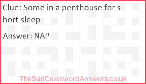 Some in a penthouse for short sleep is a crossword clue for which we have 1 possible answer and we have spotted 1 times in our database. This crossword clue was last seen on 17 February 2019 in The Sun Cryptic Crossword puzzle!